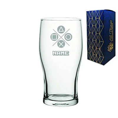 Personalised Engraved Pint Glass with Play Controller Button Design, Gift Boxed, Personalise Any Name for Gamer