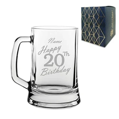 Personalised Engraved Tankard Beer Mug Stein Happy 20th Birthday Handwritten Design Gift Boxed, 16.75oz/495ml Classic Glass, Any Name, in The UK