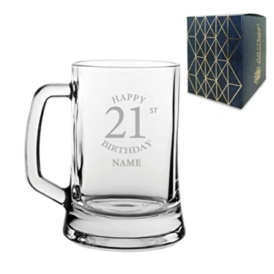 Personalised Engraved Tankard Beer Mug Stein Happy 21st Birthday Classic Design Gift Boxed, 16.75oz/495ml Glass, Any Name, in The UK
