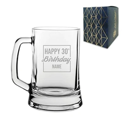 Personalised Engraved Tankard Beer Mug Stein Happy 30th Birthday Square Design Gift Boxed, 16.75oz/495ml Classic Glass, Any Name, in The UK