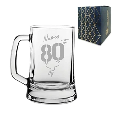 Personalised Engraved Tankard Beer Mug Stein Happy 80th Birthday Balloon Design Gift Boxed, 16.75oz/495ml Classic Glass, Any Name, in The UK