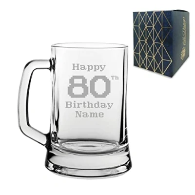 Personalised Engraved Tankard Beer Mug Stein Happy 80th Birthday Pixelated Design Gift Boxed, 16.75oz/495ml Classic Glass, Any Name, in The UK