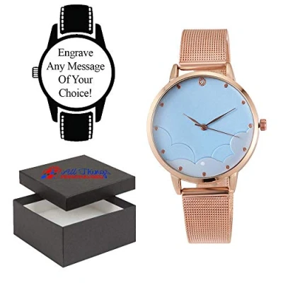 Personalised Engraved Watch, Gold Metal Strap with Blue Face. Perfect for Mother's Day, Christmas or a Gift