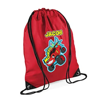 Personalised Funny Monster Truck Gift for Kids Boys Toddlers Birthday Back To School Drawstring Bag, PE Gym Kit, Swimming Rucksack. (Classic Red)