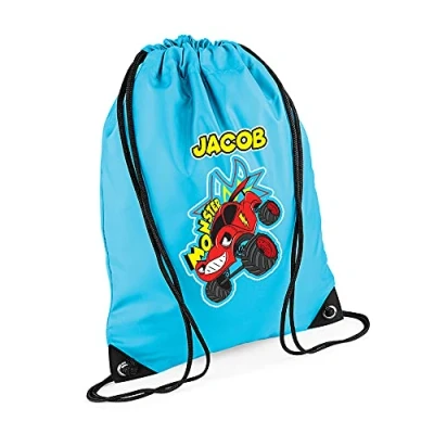 Personalised Funny Monster Truck Gift for Kids Boys Toddlers Birthday Back To School Drawstring Bag, PE Gym Kit, Swimming Rucksack. (Surf Blue)