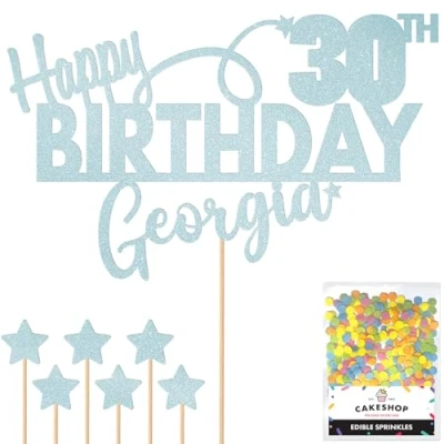 Personalised Happy Birthday Glitter Cake Topper by Cakeshop Custom Colour Any Name & Age Decoration for 1st 10th 16th 18th 20th 21st 30th 40th 50th 60th 70th 80th (Baby Blue)