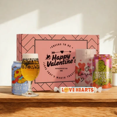 Happy Valentine’s Beavertown Gift Set Hoppy, Playful, and Perfect for Valentine’s Day Celebrate Valentine’s Day with a bold craft beer twist thanks to the Happy Valentine’s Beavertown Gift Set with Chocolate & Love Hearts. Designed for fans of modern, flavour-forward beer, this thoughtful gift combines two standout Beavertown brews with sweet Valentine’s treats and premium glassware — making it a memorable alternative to traditional fizz or spirits. Beavertown’s vibrant, hop-led beers pair perfectly with the included Beerhunter schooner glass, allowing every sip to be enjoyed at its best. What’s Inside the Gift Set * 1 x Beavertown Lunar Haze (330ml) – Juicy, hazy pale ale * 1 x Beavertown Lupuloid IPA (330ml) – Bold, hop-forward IPA * 1 x Beerhunter schooner glass * Valentine’s chocolate bar * Love heart sweets Perfect for Valentine’s Gifting Whether you’re gifting a craft beer lover or planning a relaxed Valentine’s night in, this Beavertown Valentine’s Gift Set delivers flavour, fun, and a touch of romance. Thoughtfully presented and ready to enjoy, it’s a gift that proves great beer deserves a place in Valentine’s celebrations. 🍻❤️