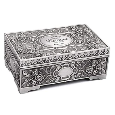 With exquisite laser engraving on the lid, this high-end silver jewellery box can be customized according to your need Wonderful gift choice for daughter, sister, girlfriend, wife, mom, granny or anyone else for Birthday, Wedding, Anniversary, Valentine or Christmas gift Lined with black velvet, this vintage rectangle jewellery case organises and protects your rings, necklaces, bracelets, earrings and cufflinks Please select your favorate style and click customize now to add your words Trinket box size: 131mm x 87mm x 53mm