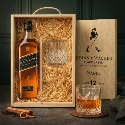 Personalised Johnnie Walker Black Label 12 Year Old Scotch Whisky Gift Set with Glass This Johnnie Walker Black Label Whisky Gift Set is the perfect gift for Whisky lovers. This set is ideal for birthdays, Christmas, Father's Day, etc. This gift comes with a crystal glass to enjoy their favourite whisky in. Johnnie Walker Black Label The blended whiskey from Johnnie Walker is a rich and smooth scotch made using the finest single malt and grain whiskies and aged 12 years in a cask. This blend results in a complex flavour profile of sweet fruit, spice and vanilla toffee - rounded off with a warm and smoky finish. Best Served over ice or as a long drink with ginger ale. Personalised Whisky Gift Sets Browse our selection of personalised whisky gifts including brands such as; Jack Daniels, Jamesons, Proper 12, Glenfiddich, Glengoyne and more.