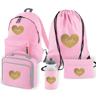 Personalised Pencil Case: Ideal for storing stationery. Dimensions: 14 x 21 cm. Capacity: 0.5 litre. Custom Water Bottle: A 500ml BPA-free water bottle. Dimensions: 7.5 x 7.5 x 20 cm. Capacity: 0.5 litre. Personalised Lunch Bag: Fully insulated with extra front zip pocket. Dimensions: 24 x 20 x 8 cm. Capacity: 3 litres. Custom Backpack: Available in two sizes to suit your child's needs. Dimensions (Large 18L): 42 x 31 x 21 cm. Personalised PE Kit Bag: A water-resistant bag for sports kits. Dimensions: 45 x 33 cm. Capacity: 11 litres.