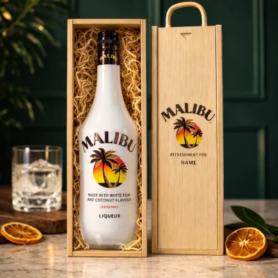Indulge in the tropical flavours of our Personalised Malibu Original Coconut White Rum Gift Set. Featuring a smooth 70cl bottle of Malibu Original Coconut White Rum (21% ABV), this bespoke offering is the perfect way to add a touch of paradise to any occasion. Personalise the rustic wooden box with a name and add a gift card to make it an unforgettable gift for any rum lover.
