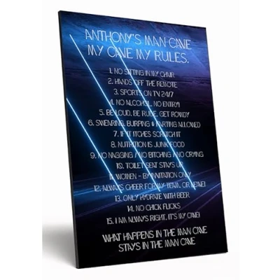 🏠 The Ultimate Customised Man Cave Rules: Add a name to the hilarious rules like “Be LOUD, be RUDE” and “Women by invitation only” make this sign perfect for any man looking to establish his sanctuary—ideal for man caves, gaming rooms, home bars, or any space that’s all about the guy! 🎨 Bold & Rustic Style for Men’s Décor: A choice of mascualine designed backgrounds - dark wood, distressed grunge and foot themed - with bold, playful text adds character to any masculine space, giving garages, sheds, and basements a style upgrade with a splash of humor and personality. 💪 Built to Last, 6mm MDF: A4 sixed (21cm x 30cm) Printed on thick MDF wood, this sign is much more durable than paper prints. Designed for years of display, it withstands the man cave lifestyle with ease, whether that means loud nights or lots of visitors! 🖼️ Frame-Free & Easy Wall Mounting: This sign mounts flush against any wall with no frame needed—providing a sleek, easy way to make any room look polished and official without extra hassle. Hang it and let the man cave vibes begin! 🎁 Made in the UK & Perfect Gift for Men: Proudly UK-made, this customised sign makes a thoughtful, funny gift for birthdays, Father’s Day, or Christmas—ideal for dads, husbands, uncles, or friends who take their man cave rules seriously… or not!
