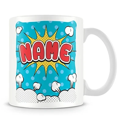 Personalised Mug Add Name Comic Style Design Ideal for Work or Gift Blue