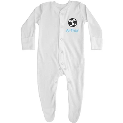 Personalised Name & Football Embroidered Baby All in One Sleepsuit (12 18 Months, Sky Blue Embroidery)