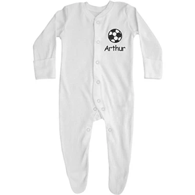 Personalised Name & Football Embroidered Baby All in One Sleepsuit (9 12 Months, Black Embroidery)