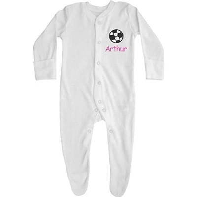 Personalised Name & Football Embroidered Baby All in One Sleepsuit (9 12 Months, Pink Embroidery)