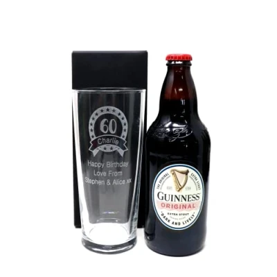 Made from Non Nucleated Glass. Personalise our pint glass for any special birthday. Click the customise now button to add your personalisation details and view a preview of what the glass will look like. Please note: The preview is only a mock-up of the glass & the final engraving size may vary. Personalise with an age, name and a message of up to 60 characters Comes complete with a bottle of beer. The glass comes in a cardboard gift box.