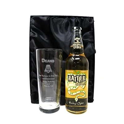 Personalised Pint Glass & Cider Darth Vader Star Wars Design (Rattler Pineapple Cornish Cider, Silk Lined Gift Box)