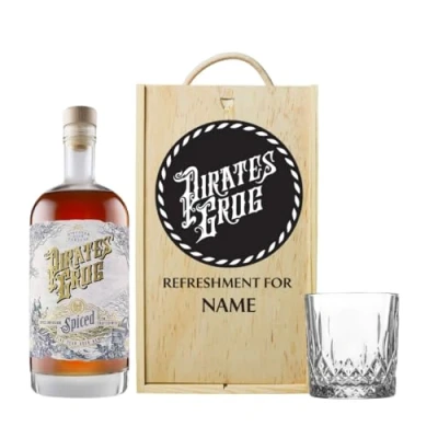 A Treasure Trove of Flavour Pirate's Grog Spiced Rum is a smooth blend of 5-year aged rum infused with spices like vanilla, cinnamon and allspice. Crafted in the tropics and packed with character, this 70cl bottle is ideal for sipping or mixing into bold cocktails. Personalised for a Legendary Gift Make it extra special with a personalised message engraved on the bottle. Whether it's for a birthday, thank-you, or a gift fit for a modern-day buccaneer, your custom touch adds charm and sentiment. Premium Glass & Wooden Presentation This gift set includes a stylish rum glass and a rustic wooden presentation box – ready to impress right out of the crate. It's gifting made easy, with zero need for wrapping. Ideal for Spiced Rum Adventurers With rich flavour and a personal message, this Pirate's Grog set is a true catch for any rum fan. A bold and memorable gift that sails beyond the ordinary.