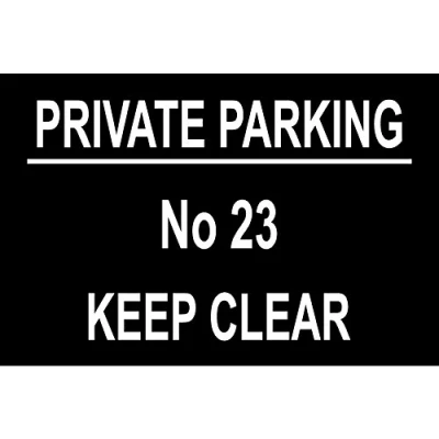 PERSONALISED PRIVATE NO PARKING LARGE SIGN BLACK / WHITE DESIGN 1.2mm rigid plastic 300mm x 200mm Message us with number when ordering Drill and screw in position or use double sided tape to mount onto suitable surface.