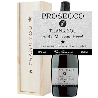 Personalised Prosecco Thank You Gift Set Wooden Box with Custom Bottle Label 75cl Vino Spumante (Thank Box)