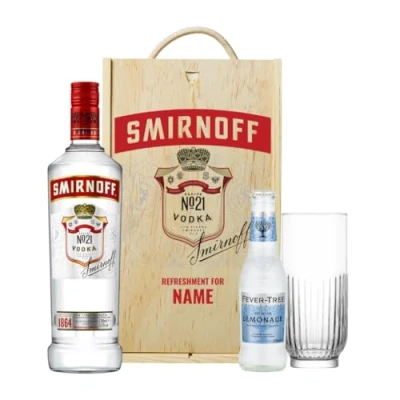 Welcome to the epitome of refined taste! Our Personalised Smirnoff Vodka Gift Set offers triple distilled excellence. Paired with a rocks glass & Fever Tree Lemonade, it's a 70cl delight at 37.5% ABV, promising an unforgettable experience. Experience triple distilled perfection with our Personalised Smirnoff Vodka Gift Set. Complete with a rocks glass & Fever Tree Lemonade, this 70cl bottle at 37.5% ABV offers unparalleled luxury and refreshment. Ideal for gifting or indulging, our Personalised Smirnoff Vodka Gift Set offers a tailored touch to any occasion. With its triple distilled purity, accompanied by a rocks glass & Fever Tree Lemonade, it's the epitome of sophistication and refreshment, perfect for those who appreciate the finer things in life. Elevate any celebration with our Personalised Smirnoff Vodka Gift Set! Indulge in triple distilled perfection, complete with a rocks glass & Fever Tree Lemonade. Customize for the perfect gift or treat yourself to luxury in every sip. This Personalised Smirnoff Vodka gift set is packaged safely and securely ready for delivery to your doorstep.