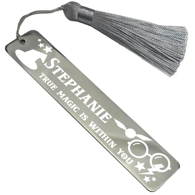 📚 Personalised wizarding world inspired stainless steel bookmark: Crafted from durable, mirror-finished stainless steel, this bookmark not only adds a touch of magic to your reading but also ensures longevity and style. 🎁 Magical gift for book wizards, personalised with a name: customise with a name to create a personalised gift that resonates with the recipient's love for wizardry and magic. 💎 Mirror-finished 1.2mm thick stainless steel with luxury cotton tassel: The bookmark is the perfect size - 125mm x 25mm. High-quality materials ensure a polished look and feel. The soft cotton tassel, available in complimentary colours (silver, gold, rose gold, or blue) adds a touch of luxury. 🌈 Available in silver, gold, rose gold, or blue colour options: Choose a colour that reflects your magical style or matches your favorite enchanted book. Each option radiates sophistication and enhances the bookmark's magical appeal. 🧙 Choose from various iconic designs during customisation: Explore designs inspired by magical elements, mystical potions, ancient spells, and enchanted objects. Each design captures the essence of wizarding adventures and adds a touch of magic to your reading journey.