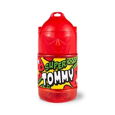 Superhero personalised kids drinks bottle with straw and non-spill seal. Personalised with over 100 popular childrens names. Features girls or boys super-bright tactile 3D superhero moulding for added Kapow Perfect for school bags, days out and dinnertimes! Slide back lid reveals silicon straw then seals it closed to avoid any spillage,