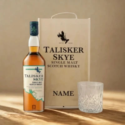 Personalised Talisker Skye Single Malt Scotch Whisky Gift Set with Glass This Talisker Skye Single Malt Scotch Whisky Gift Set is the perfect gift for Whisky lovers. This set is ideal for birthdays, Christmas, Father's Day, etc. This gift comes with a crystal glass to enjoy their favourite whisky in. Talisker Skye This Single Malt Whisky from Talisker has been produced at the oldest distillery on the Isle of Skye since 1830. Talisker Skye presents a sweet flavour profile with notes of fresh citrus, spicy pepper and warm smoky notes. This delicious whisky is matured in mainly toasted American oak casks as well as refill casks. Best Served over ice, neat or with a splash of water.