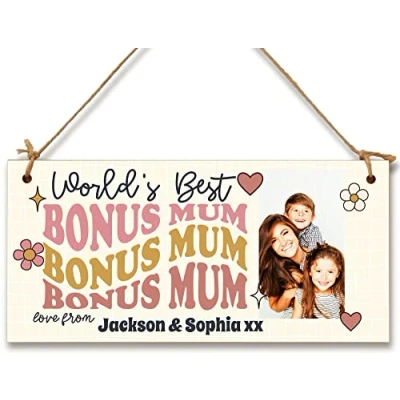 Personalised Wooden Plaque with Photo World's Best Bonus Mum Stepmum Mother's Day Sentimental Door Sign Hanging Home Decor