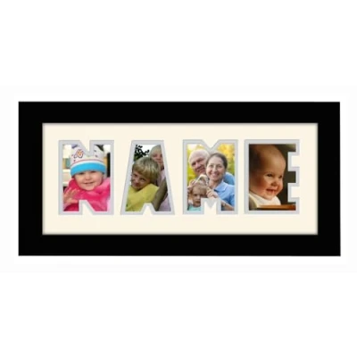 Personalised Word Photo Frame Name Birthday Picture Gift Present (Black Finish Cream Mount Grey Inside, 4 Letters (Letters only no spaces))