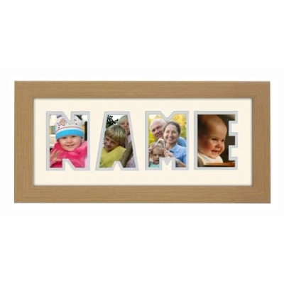 Personalised Word Photo Frame Name Birthday Picture Gift Present (Oak Finish Cream Mount Grey Inside, 4 Letters (Letters only no spaces))