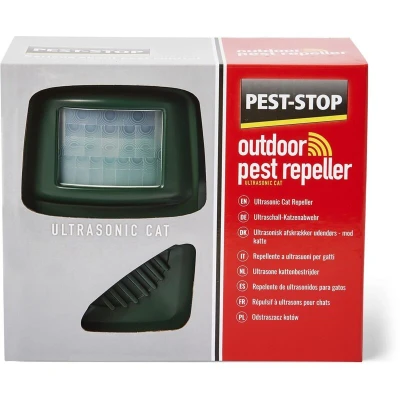 General description The Pest-Stop Ultrasonic Cat Repeller uses ultrasonic sound to repel unwanted cats at a frequency too high for humans to hear, providing a humane solution to unwanted pests. This device emits ultrasonic frequencies designed to repel various animals, including rodents, dogs, cats, rabbits, squirrels, and foxes, which cannot hear the high-frequency sound. It helps keep your property free of unwanted animals. Technical specifications Frequency range targets animals, inaudible to humans Effective range of 15 meters (117 square meters) Rotates 60 degrees for wider coverage Operates in cycle mode or with a PIR infrared motion sensor Requires 2 x 9V batteries (not included) Compatibility and accessories Suitable for outdoor and indoor use Can be mounted on a wall or placed on the ground with a stake Wall bracket and ground mounting stake included for flexible installation Optional mains power kit available Installation Mount on a wall or insert into the ground using a
