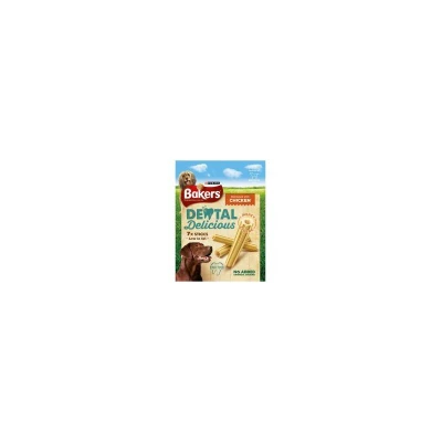 General description BAKERS Dental Delicious is a specially shaped chewy treat designed to help keep your dog's teeth clean and gums healthy, featuring a soft meaty filling that encourages your pet to come back for more! Technical specifications Weight: 200g Protein: 16% Fat content: 4% Crude ash: 10% Crude fibres: 1% Moisture: 18% Ingredients Cereals Meat and animal derivatives (min. 1.3% chicken) Minerals Vegetable protein extracts Derivatives of vegetable origin Oils and fats Yeasts