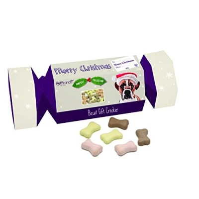 Our Three Bird Roast biscuit cracker is sure to have your dog licking his lips and wagging his tail Each cracker contains 3x 100g bags of whole-wheat tasty biscuit bones Different flavours: chicken, turkey & duck Comes beautifully presented in gift packaging shaped as a cracker These biscuits will make a great treat for your pet, enjoying all the flavours the festive season brings