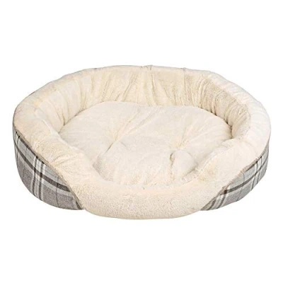 Pet Brands Grey Tartan Check Round Dog Bed, Medium/Large Bed with Warm Plush & Reversible Inner
