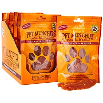 100% NATURAL, PREMIUM REAL CHICKEN: This gourmet treat is made with 100% natural, human-grade, chicken breast meat - delicately slow roasted to perfection in their own natural juices HEALTHY & JUNK-FREE: Our healthy chicken breast fillets contain no artificial colours or flavours, are naturally high in protein, grain and gluten free and low in fat & salt making them the perfect treat to feed your four legged friends PERFECT FOR TRAINING: These tender fillets of chicken can be given as a chew, and are easy to break up for delicious training and reward treats for walks and recall SUITABLE FOR ALL BREEDS & SIZES: Our chicken breast fillets are suitable for all breeds of dogs and puppies over 4 months - please remember that these treats should make up a small part of your pet's balanced diet SEALED WITH A DOG'S APPROVAL: Pet Munchies is a UK based company dedicated to creating premium, gourmet treats that are made with high quality, human grade meat. Our treats are delicious, nutritious and wholesome, with all the meaty flavours dogs love delicately toasted to perfection!