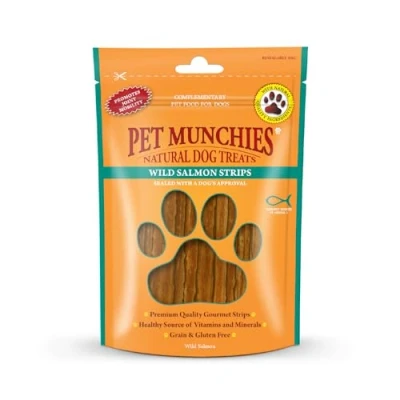 100% NATURAL, PREMIUM REAL SALMON: This gourmet treat is made with 100% natural, human-grade, wild salmon meat A HEALTHY SOURCE OF OMEGA 3: Salmon provides ahealthy source of Omega 3, vitamins and minerals for supporting optimal brain & eye function and a maintaining healthy skin & coat HEALTHY & JUNK-FREE: Our healthy wild salmon strips contain no artificial colours or flavours, are grain and gluten free and a single source protein, making them the perfect treat to feed your four legged friends SUITABLE FOR ALL BREEDS & SIZES: Our wild salmon strips are suitable for all breeds of dogs and puppies over 4 months - please remember that these treats should make up a small part of your pet's balanced diet SEALED WITH A DOG'S APPROVAL: Pet Munchies is a UK based company dedicated to creating premium, gourmet treats that are made with high quality, human grade meat. Our treats are delicious, nutritious and wholesome, with all the meaty flavours dogs love delicately toasted to perfection!