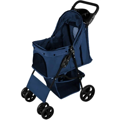 Pet Stroller Pushchair Navy Blue Carrier Foldable Trolley Travel Cart 15kg Capacity 4 Wheels Brakes Cat Dog Safety Hook Leash Cushion Canopy Mesh Windows Basket Cup Holders & Waterproof Rain Cover