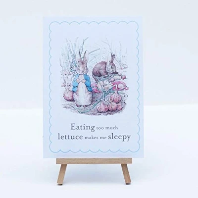 A beautifully designed A5 card sign with a Peter Rabbit image on and the words 'Eating too much lettuce makes me sleepy' Fun to display at your Peter Rabbit themed party or event. It comes with a plain wooden easel to display it on. Complete the Peter Rabbit look with all our additons including stickers, plates, cups, paper bags and more.