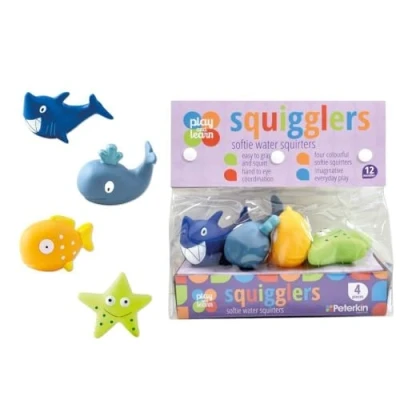 PLAY & LEARN WITH PETERKIN: This Squigglers set includes 4 soft and squidgy Under water characters that can squirt water. PERFECT FOR SMALL HANDS: Each Squiggler measures around 8cm and is made from soft touch material making them easy to grasp and squeeze. FUN WITH WATER: Squigglers are designed to be played with in water – ideal for bath time fun or outdoor play. EARLY DEVELOPMENT: Squigglers can help develop fine motor skills and hand-eye coordination. IMAGINATIVE PLAY: Squigglers are perfect for your little ones to start developing imaginative play., Manufacturer: Peterkin