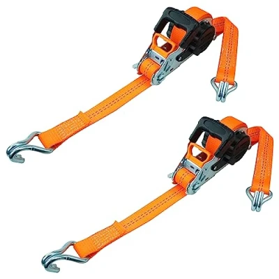 PETEX 2 x Automatic Ratchet Tie Down Strap, Self Reeling, 1 Piece, 5 m 35 mm, 1,000/2,000 daN, Orange, Double Pointed Hook