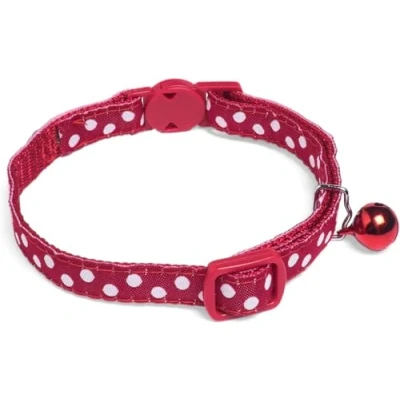 RED DOT PRINT: A stylish collar for your feline friend, adjustable and comfortable with an added safety clip bell for peace of mind FEATURES: Made from durable nylon, this black cat collar is designed to last and keep your pet safe during outdoor adventures BENEFITS: Elasticated design ensures a snug fit without compromising on comfort or causing discomfort to your beloved cat SAFETY FIRST: The safety clip allows for quick release in case of emergencies, providing added security for curious cats who love exploring the outdoors CUSTOM FIT: Easily adjustable to ensure a perfect fit that keeps your kitty feeling secure and looking fabulous all day long