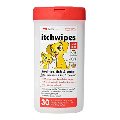 Petkin Cat and Dog Wipes for Itching – Petkin Itch Wipes provide an easy way to soothe your pet's itching and discomfort caused by hot spots, skin irritations and scratching. Includes 30 wipes Soothing – The cool formula soothes itch and pain on contact to reduce your pet's scratching, licking and chewing. Bitter taste stops licking and chewing on irritated areas Veterinarian Approved – Gently wipe itchy, irritated areas with the Petkins wipes. Apply up to 3 to 4 times daily as needed. (Test on small area before first use in case of sensitive skin.). The 5 x 7 inch wipes are enriched with a soothing oat and aloe extract Easy to Use – Open the lid and remove seal. Pull a dog wipe out. Close lid tightly. Pull wipe up and tear at slight angle. No water or rinsing is required. For dogs and cats of all ages Convenient – Perfect for at home and travel, these dog wipes are safe for daily use. Ingredients include Pure Witch Hazel, Aloe Vera Gel, Comfrey, Oatmeal, Vitamins A, B & E, Bitter Taste