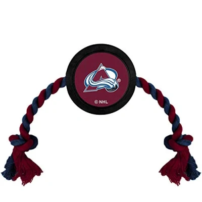 Pets First Colorado Avalanche NHL Hockey Puck Toy for Dogs & Cats, Heavy Duty Rubber with Rope Tug, Officially Licensed, 15 x 3 1 Inches