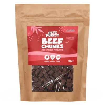 Beef Chunks Dog Treats: Made from premium beef, our air-dried beef bites are dog and puppy training treats you can feel good about. A healthy any-time reward, and perfect dog training treats, our natural dog treats are nutrient dense and highly palatable for even the pickiest of eaters. The healthy alternative to processed dog biscuits, give our dog and puppy treats from 8 weeks for a natural meaty flavour they will love. Air-Dried Raw Dog Treats: Packed with natural goodness, our air-dried beef dog treats are gently prepared using a slow, low-temperature drying process, locking in flavor and preserving vital nutrients your dog needs to thrive. Ideal for raw-feeding diets, and made with a single-source protein, our beef treats have a chewy, satisfying texture with the rich taste of real meat Delicious & Nutritious Beef Treats for Dogs: Made from 95% premium air-dried beef, our nutrient rich dog treats beef deliver high quality protein that keeps a dog functioning and strong. Providing all essential amino acids for muscle development, tissue repair, and immune health, plus a healthy balance of protein and good fat to provide sustained fuel for daily activity, making these treats great for active, working, or growing dogs. Highly digestible and very palatable, beef is packed with vital vitamins and minerals, including B Vitamins, Iron, Zinc, and Selenium. Grain Free Dog Treats: Grain free, single-source protein training treats for dogs, ideal for dogs with specific dietary needs or sensitivities. Some dogs react poorly to grains, developing symptoms such as itchy skin, ear infections, or digestive upset. Grain-free treats eliminate those triggers and dogs with sensitive stomachs digest grain-free formulas better. We skip low-nutrient fillers and focus on high quality meat as our primary ingredient. No Nasties Natural Dog Chews: Pets Purest range of dog treats for large dogs, medium dogs and small dogs are hypoallergenic and made of the very best natural ingredients, to help keep pets feeling healthy from the inside out! Unlike traditional dog food and treats, which are packed full of unnecessary ingredients with no beneficial effects for your pup, Pets Purest treats only contain ingredients that truly benefit your pet's health. And we are proud to say they are really tasty too!