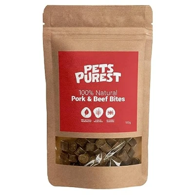 Pets Purest Natural Dog Treat Chews 100% Healthy Air Dried Pork and Beef Sausage Bites for Dogs, Puppy & Senior. Grain Gluten Free Low Fat Raw Protein Food Snack (100g)
