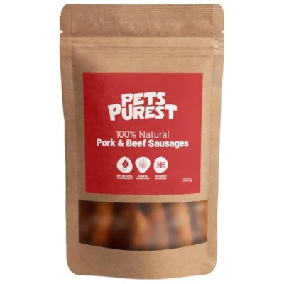 Pets Purest Natural Dog Treat Chews 100% Healthy Air Dried Pork & Beef Sausage Meat Treats for Dogs, Puppy Senior. Grain Gluten Free Low Fat Raw Protein Food Snack (200g)