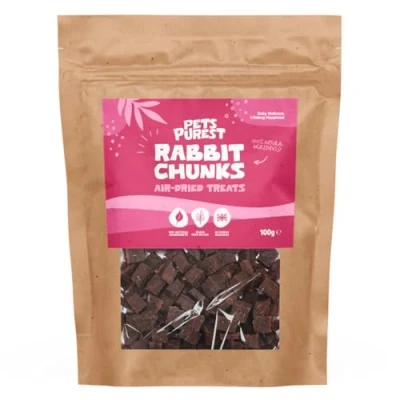 Rabbit Chunks Dog Treats: Made from premium rabbit, our air-dried rabbit chunks are dog and puppy taining treats you can feel good about. A healthy any-time reward, and perfect dog training treats, our natural dog treats are nutrient dense and highly palatable for even the pickiest of eaters. The healthy alternative to processed dog biscuits, give our dog and puppy treats from 8 weeks for a natural meaty flavour they will love. Air-Dried Raw Dog Treats: Packed with natural goodness, our rabbit treats are gently prepared using a slow, low-temperature drying process, locking in flavor and preserving vital nutrients your dog needs to thrive. Ideal for raw-feeding diets, and made with a single-source protein, our rabbit chunks have a chewy, satisfying texture with the rich taste of real meat. Delicious & Nutritious Rabbit Treats for Dogs: Made from 95% premium air-dried rabbit, our nutrient rich dog treats deliver high quality protein that keeps a dog functioning and strong. Providing all essential amino acids for muscle development, tissue repair, and immune health, while being very low in fat. Highly digestible and very palatable, rabbit is packed with vital vitamins and minerals, including B Vitamins, Iron, Zinc, and Selenium. Grain Free Dog Treats: Grain free, single-source protein training treats for dogs, ideal for dogs with specific dietary needs or sensitivities. Some dogs react poorly to grains, developing symptoms such as itchy skin, ear infections, or digestive upset. Grain-free treats eliminate those triggers and dogs with sensitive stomachs digest grain-free formulas better. We skip low-nutrient fillers and focus on high quality meat as our primary ingredient. No Nasties Natural Dog Chews: Pets Purest range of dog treats for small dogs, medium dogs and large dogs are hypoallergenic and made of the very best natural ingredients, to help keep pets feeling healthy from the inside out! Unlike traditional dog food and treats, which are packed full of unnecessary ingredients with no beneficial effects for your pup, Pets Purest treats only contain ingredients that truly benefit your pet's health. And we are proud to say they are really tasty too!