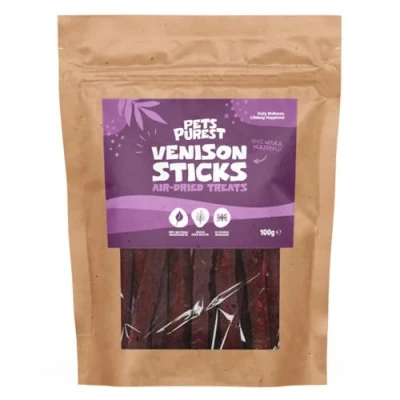 Venison Sticks Dog Treats: Made from premium vension, our air-dried venison dog and puppy training treats are treats you can feel good about. A healthy any-time reward served whole, or snap into smaller bites for perfect dog training treats, our natural dog chews are nutrient dense and highly palatable for even the pickiest of eaters. The healthy alternative to processed dog biscuits, give our dog and puppy treats from 8 weeks for a natural meaty flavour they will love Air-Dried Raw Dog Treats: Packed with natural goodness, our air-dried venison treats for dogs are gently prepared using a slow, low-temperature drying process, locking in flavor and preserving vital nutrients your dog needs to thrive. Ideal for raw-feeding diets, and made with a single-source novel protein, our venison dog treats have a chewy, satisfying texture with the rich taste of real meat Delicious & Nutritious Venison Treats for Dogs: Made from 95% premium air-dried venison, our nutrient rich, low fat dog treats provide lean high quality novel protein, perfect frequent reward training treats for dogs, or for dogs needing to lower their fat intake. Delivering a complete amino acid profile for muscle growth and repair - supporting lean muscle mass making these treats great for active, working, or growing dogs. Highly digestible, very palatable and packed with vital vitamins and minerals, including B Vitamins, Iron and Zinc for immune support, healthy skin & coat and brain health Grain Free Dog Treats: Grain free, single-source protein dog and puppy treats, ideal for dogs with specific dietary needs or sensitivities. Some dogs react poorly to grains, developing symptoms such as itchy skin, ear infections, or digestive upset. Grain-free treats eliminate those triggers and dogs with sensitive stomachs digest grain-free formulas better. We skip low-nutrient fillers and focus on high quality meat as our primary ingredient No Nasties Natural Dog Treats: Pets Purest range of dog treats for small dogs, medium dogs and large dogs are hypoallergenic and made of the very best natural ingredients, to help keep pets feeling healthy from the inside out! Unlike traditional dog food and treats, which are packed full of unnecessary ingredients with no beneficial effects for your pup, Pets Purest treats only contain ingredients that truly benefit your pet's health. And we are proud to say they are really tasty too!